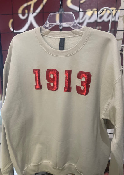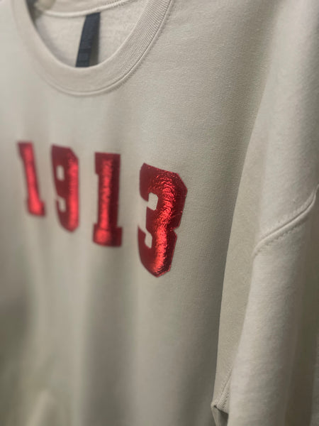Make a bold statement with the Heavy On My Chest sweatshirt. Crafted from soft cotton in a creamy shade, it features a striking metallic red puff vinyl "1913" design that pops in 3D. This standout piece fuses comfort with edgy style, perfect for those who dare to wear their story loud and proud.