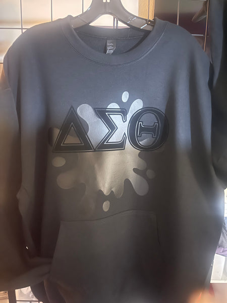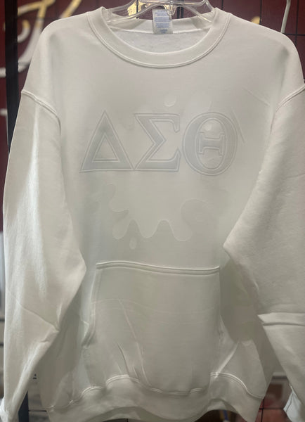Embrace subtle rebellion with this white cotton crewneck sweatshirt featuring muted tones and eye-catching DST symbols. Its unique design blends flock vinyl with simple white vinyl splats, adding texture and edge without shouting. Convenient pockets combine style with practicality, making this piece a daring staple for your everyday wardrobe.